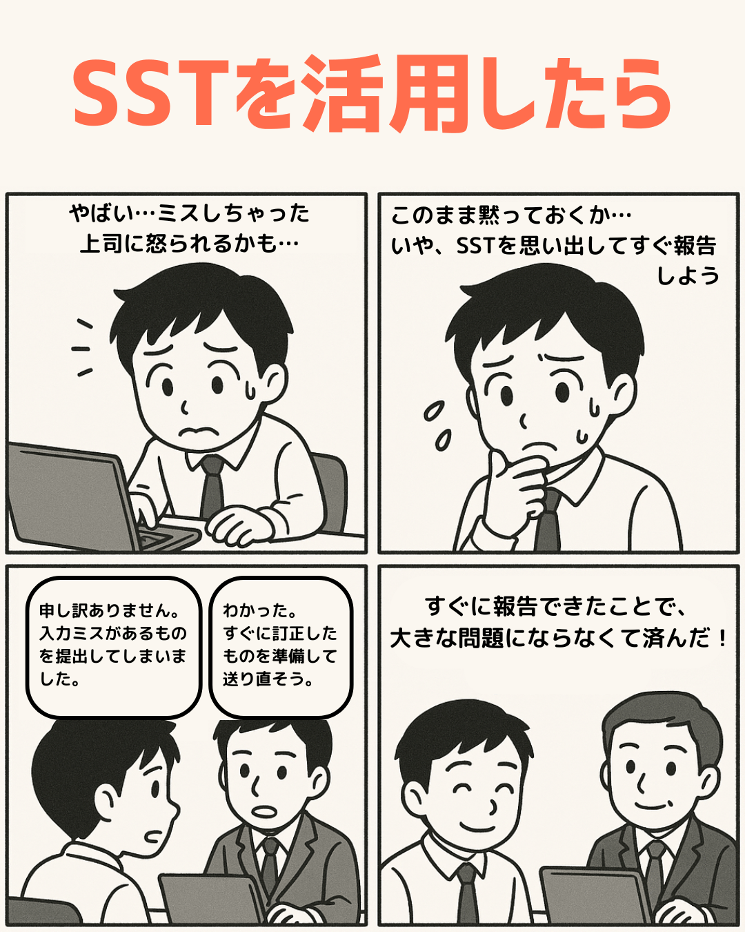 ・忙しい相手への声かけ ・業務の断り方 ・ミスをした時の報告